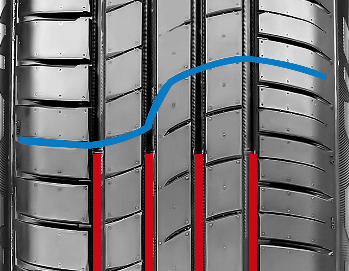 胎面采用最新的“LEADing-PATTERN”平臺概念花紋,使用內外側不同功能分工的 非對稱設計,操控更精準。同時采用 “變節(jié)距錯頻技術” 改善輪胎噪音。